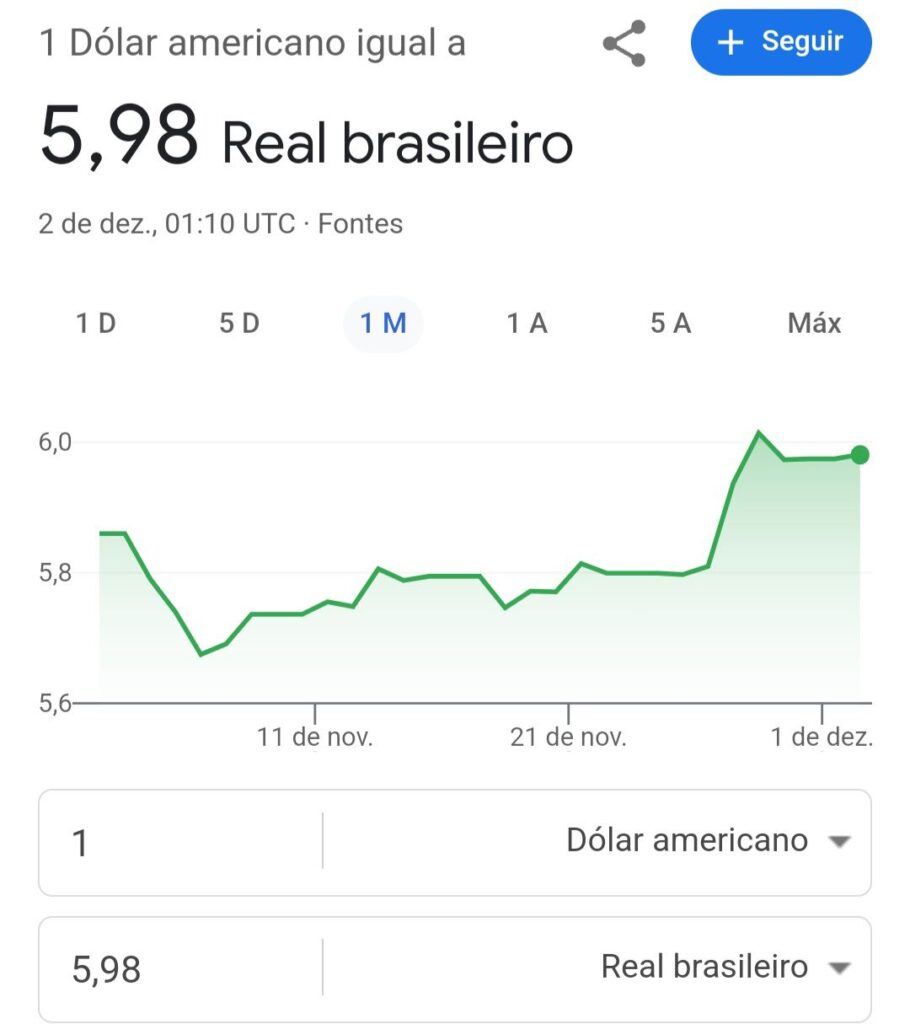 A cotação do dólar em relação ao real brasileiro no dia 01/12/2024 está variando em torno de R$ 5,98 para cada dólar americano, segundo dados mais recentes do mercado financeiro. Essa cotação pode variar ao longo do dia dependendo de fatores econômicos e políticos globais.