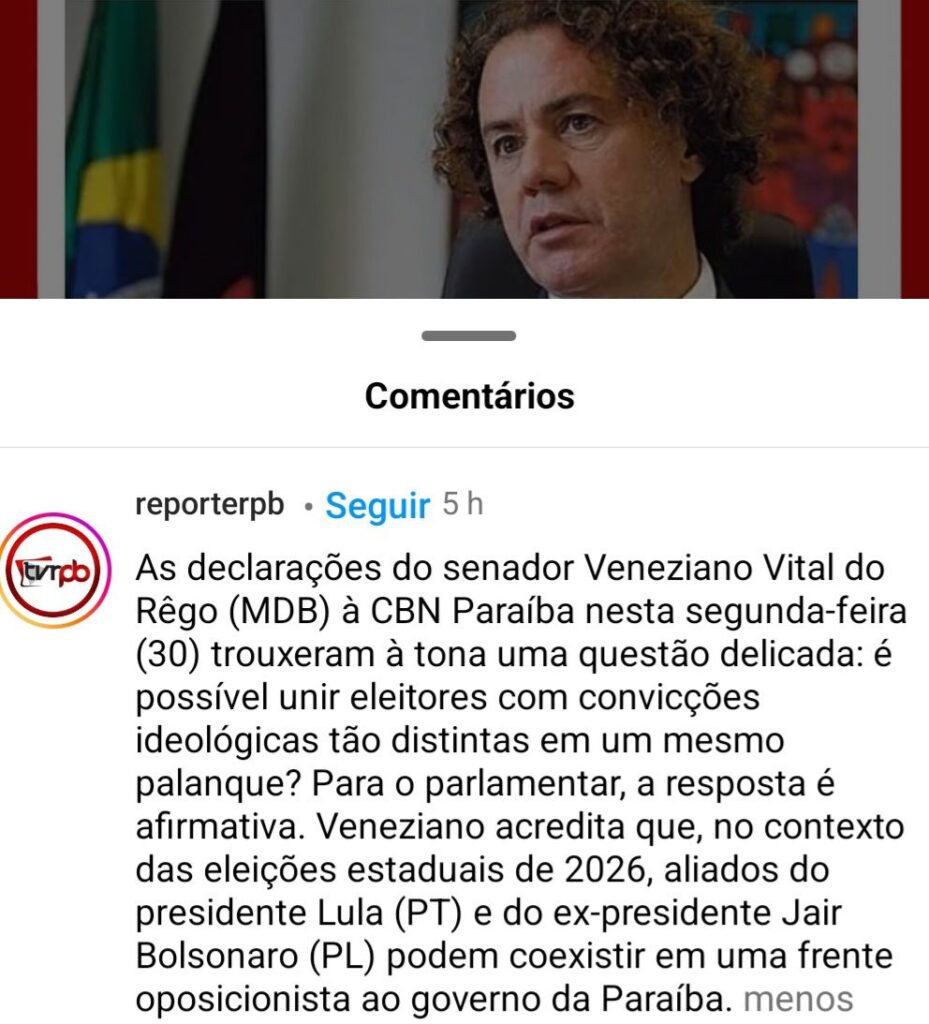 O senador Veneziano (MDB), conhecido por ser inimigo do bolsonarismo, surpreendeu o cenário político paraibano ao sugerir possíveis alianças entre aliados de Lula e Bolsonaro nas eleições de 2026. Em entrevista à CBN Paraíba, Veneziano afirmou que Cabo Gilberto e Wallber Virgolino, ambos do PL e ligados a Bolsonaro, podem se unir com “ele” em oposição ao governador João Azevêdo.