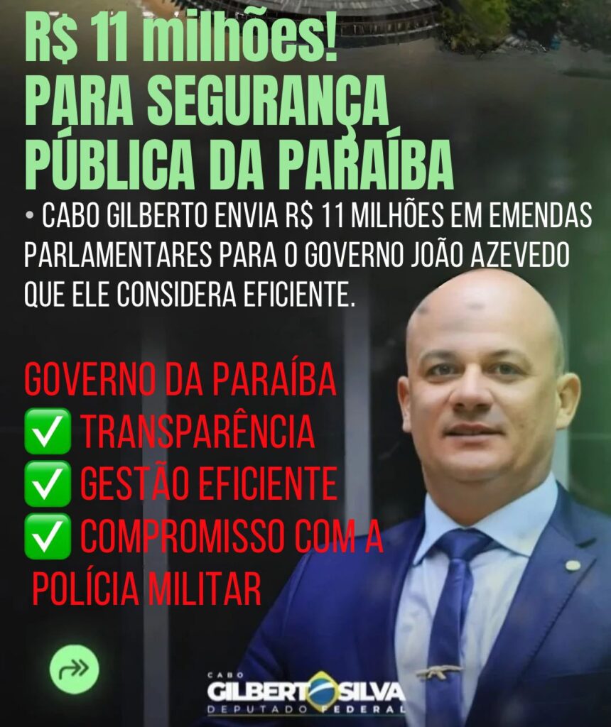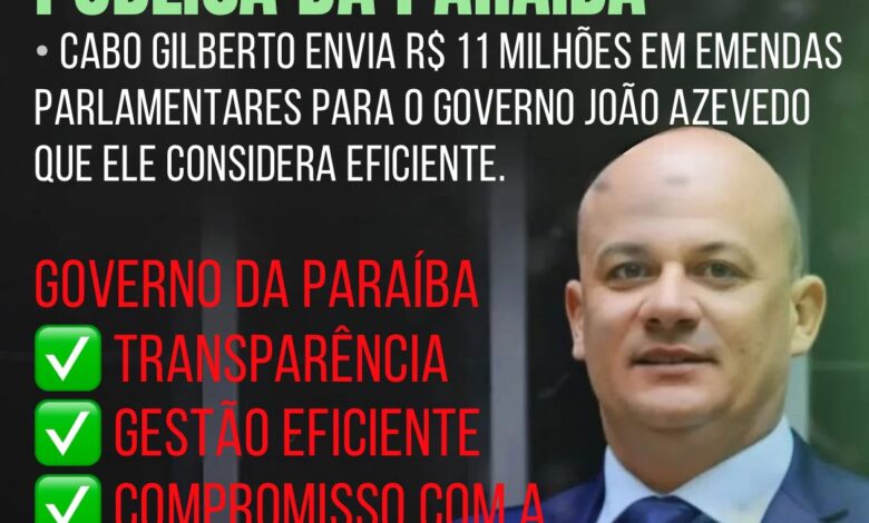 O deputado federal Cabo Gilberto Silva anunciou o envio de R$ 11 milhões em emendas parlamentares para o Governo da Paraíba, sob a gestão do governador João Azevêdo. O parlamentar destacou que a decisão de destinar esse montante reflete sua confiança na eficiência e transparência da administração estadual.