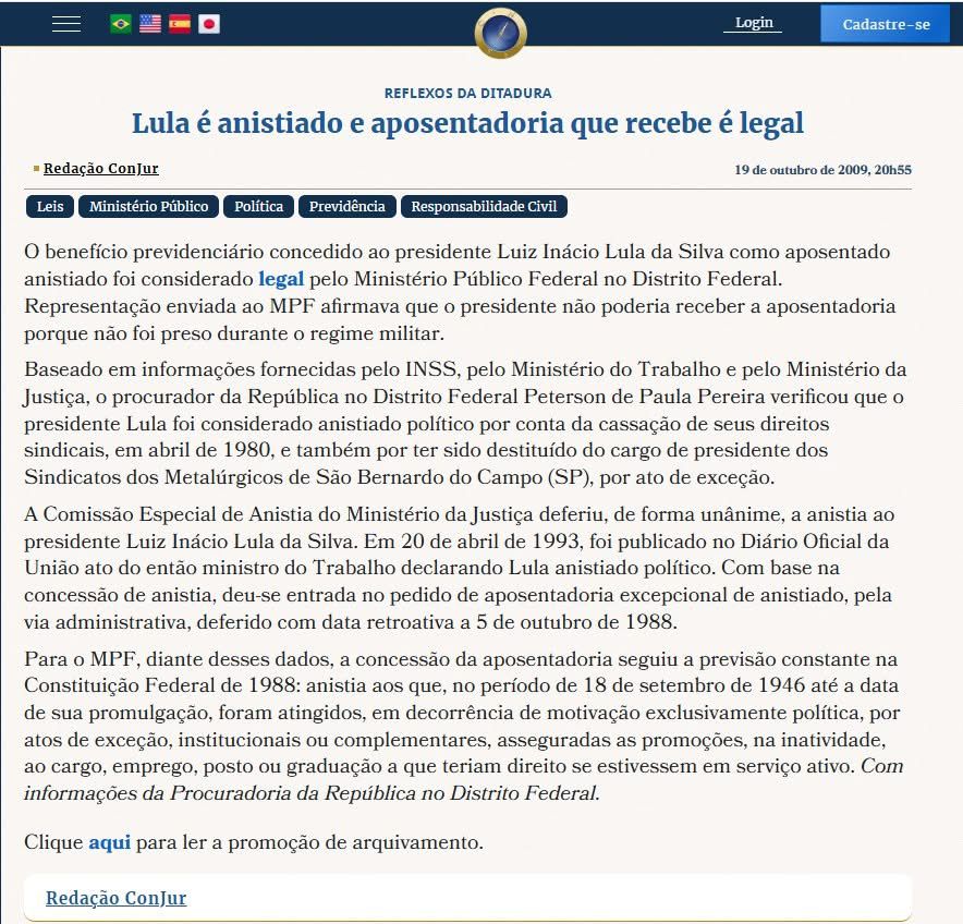 “VOCÊ SABIA? Lula foi o primeiro esquerdista anistiado em 1983 e recebe R$ 10 mil por mês?”