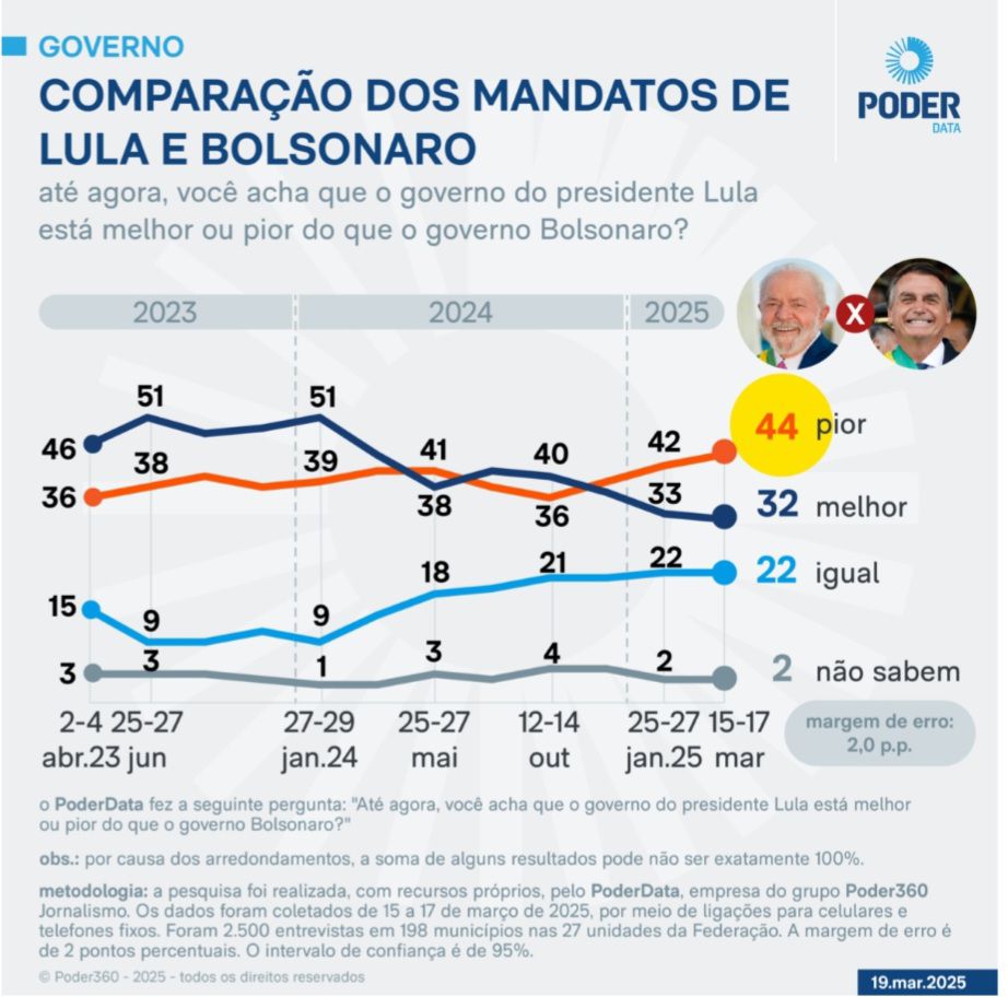 Os dados da pesquisa, realizada de 15 a 17 de março de 2025, mostram ainda que a taxa dos que preferem a atual gestão variou negativamente 1 ponto percentual em 2 meses, para 32%. Desde a posse, caiu 14 pontos percentuais. É a 4ª vez desde o início do mandato que Lula fica atrás de Bolsonaro