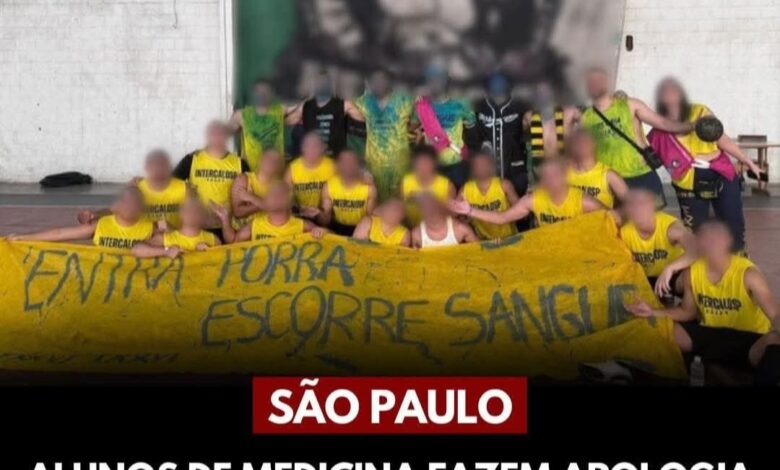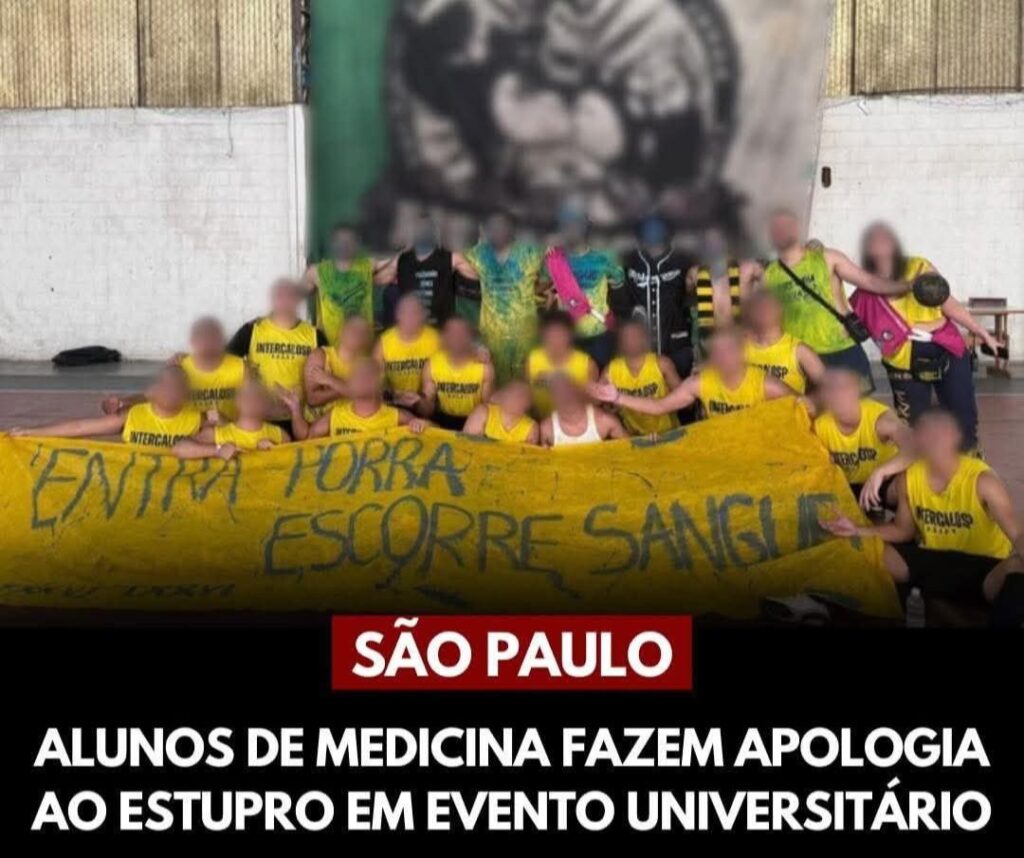 Um episódio revoltante marcou um torneio universitário realizado no último sábado (15), na zona leste de São Paulo. Alunos de Medicina da Faculdade Santa Marcelina foram flagrados segurando uma faixa com a frase “entra porra, escorre sangue”, em alusão ao estupro. A imagem, que rapidamente circulou nas redes sociais, mostra 24 estudantes — 23 homens e uma mulher — posando com a mensagem de teor violento e misógino.
