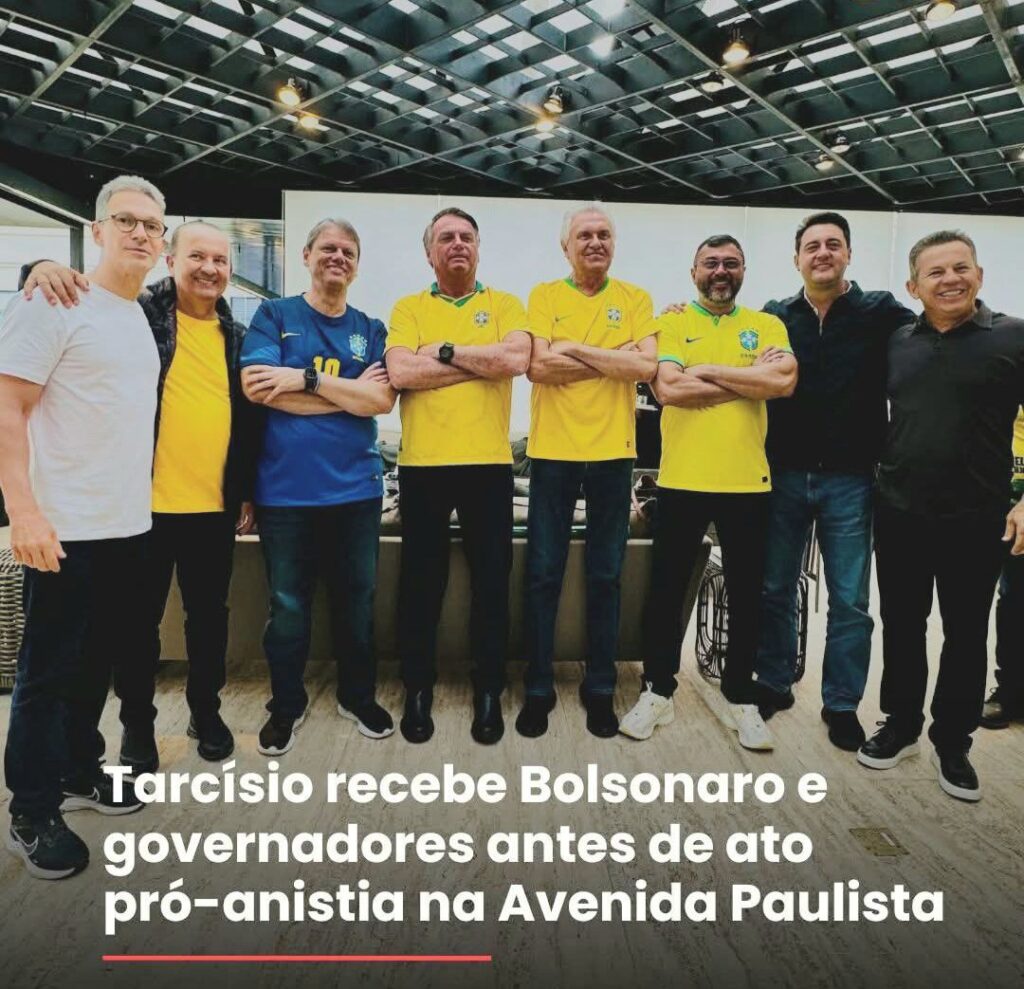 Na manhã deste domingo (6), o governador de São Paulo, Tarcísio de Freitas, recebeu no Palácio dos Bandeirantes o ex-presidente Jair Bolsonaro e governadores aliados que participarão, ainda hoje, de uma manifestação na Avenida Paulista. O ato foi convocado por opositores do presidente Luiz Inácio Lula da Silva e tem como principal pauta a defesa do projeto de anistia aos condenados pelos ataques de 8 de janeiro de 2023.