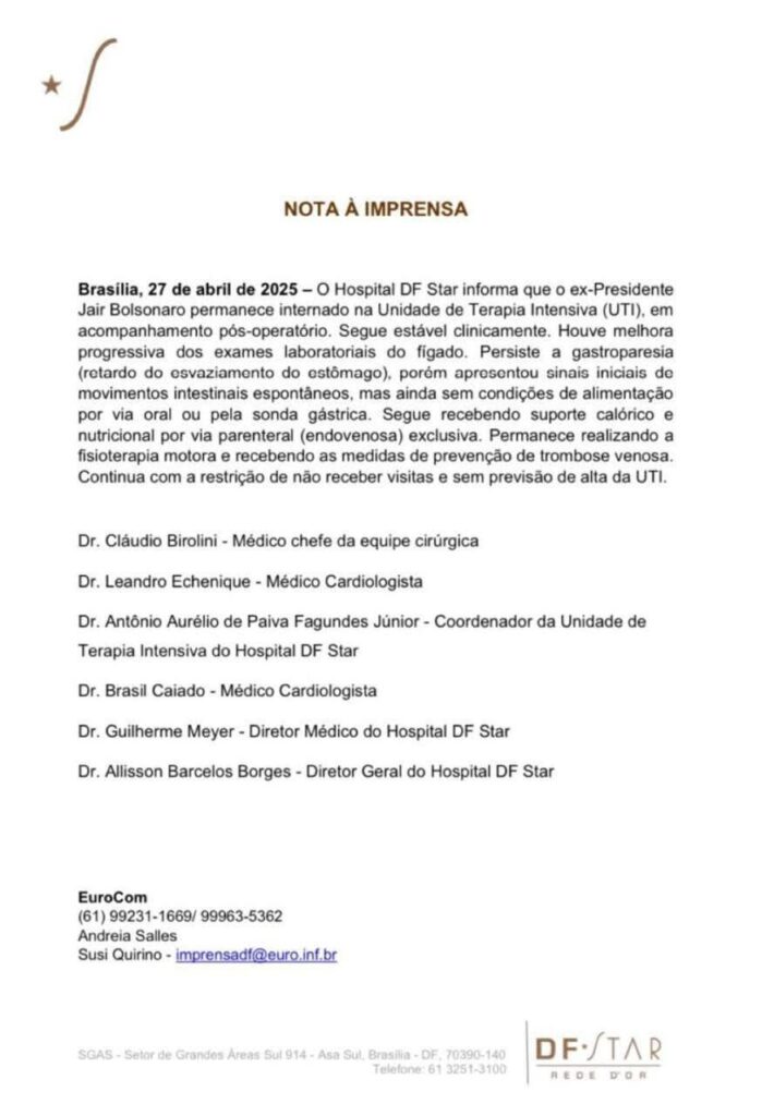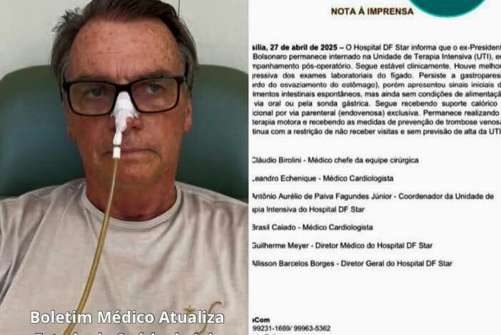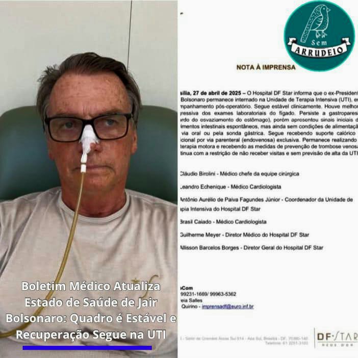 Neste sábado, 27 de abril, foi divulgado um novo boletim médico atualizando o estado de saúde do ex-presidente Jair Bolsonaro. De acordo com a equipe médica do Hospital DF Star, em Brasília, Bolsonaro permanece internado na Unidade de Terapia Intensiva (UTI), mas seu quadro clínico é considerado estável, sem novos episódios de alteração na pressão arterial.