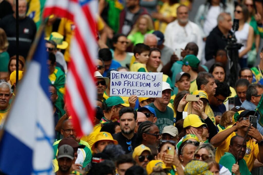 O ato também foi marcado por pautas tradicionais do bolsonarismo, como a defesa do “voto impresso e auditável”, além de exaltações ao patriotismo e nacionalismo. Um momento que chamou atenção foi o discurso do deputado federal Gustavo Gayer (PL-GO), que falou em inglês direcionando seu apelo a autoridades dos Estados Unidos, pedindo intervenção para “devolver a liberdade ao Brasil”.