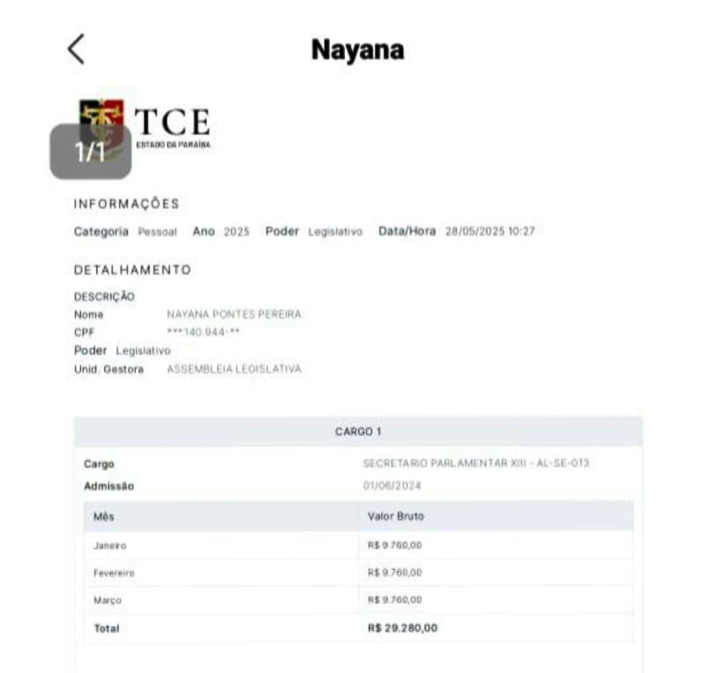 Contra cheque da Esposa do Deputado federal Cabo Gilberto (PL) na ALPB
