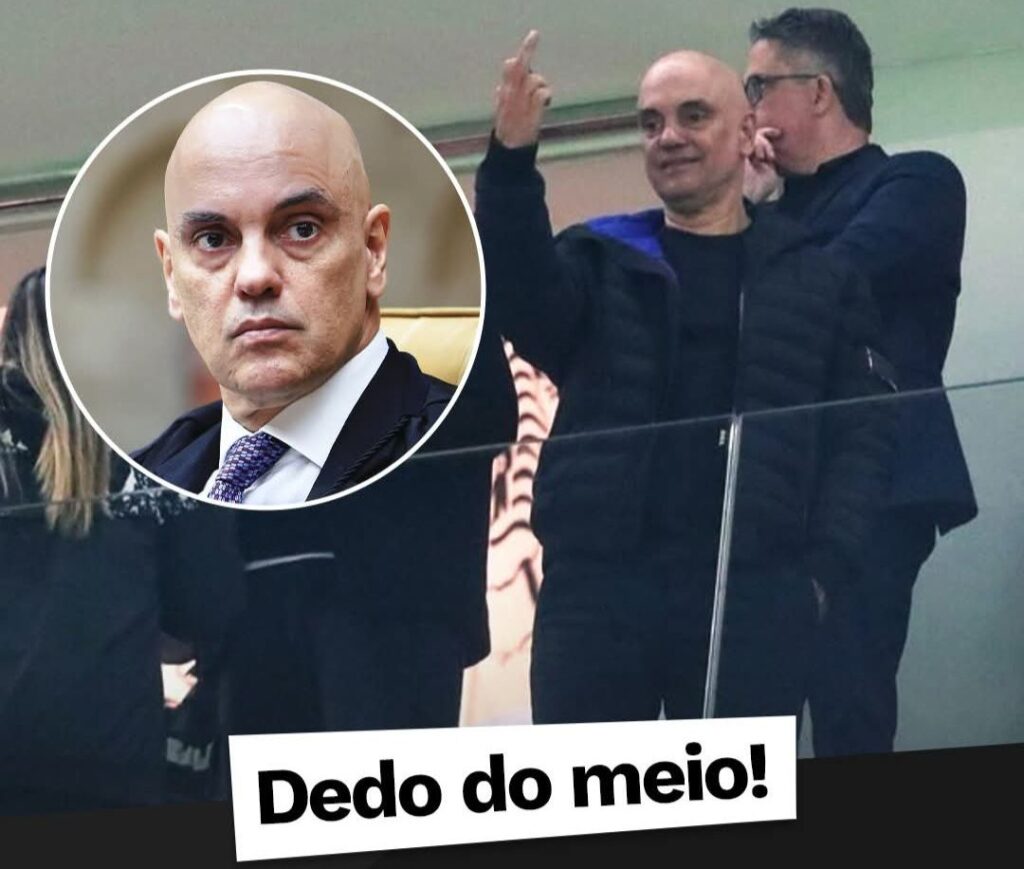 A atitude aconteceu após o ministro ser alvo de vaias e provocações vindas da arquibancada. Vídeos que circulam nas redes sociais mostram o momento exato em que Alexandre de Moraes reage com o gesto, o que imediatamente gerou repercussão entre torcedores e internautas.