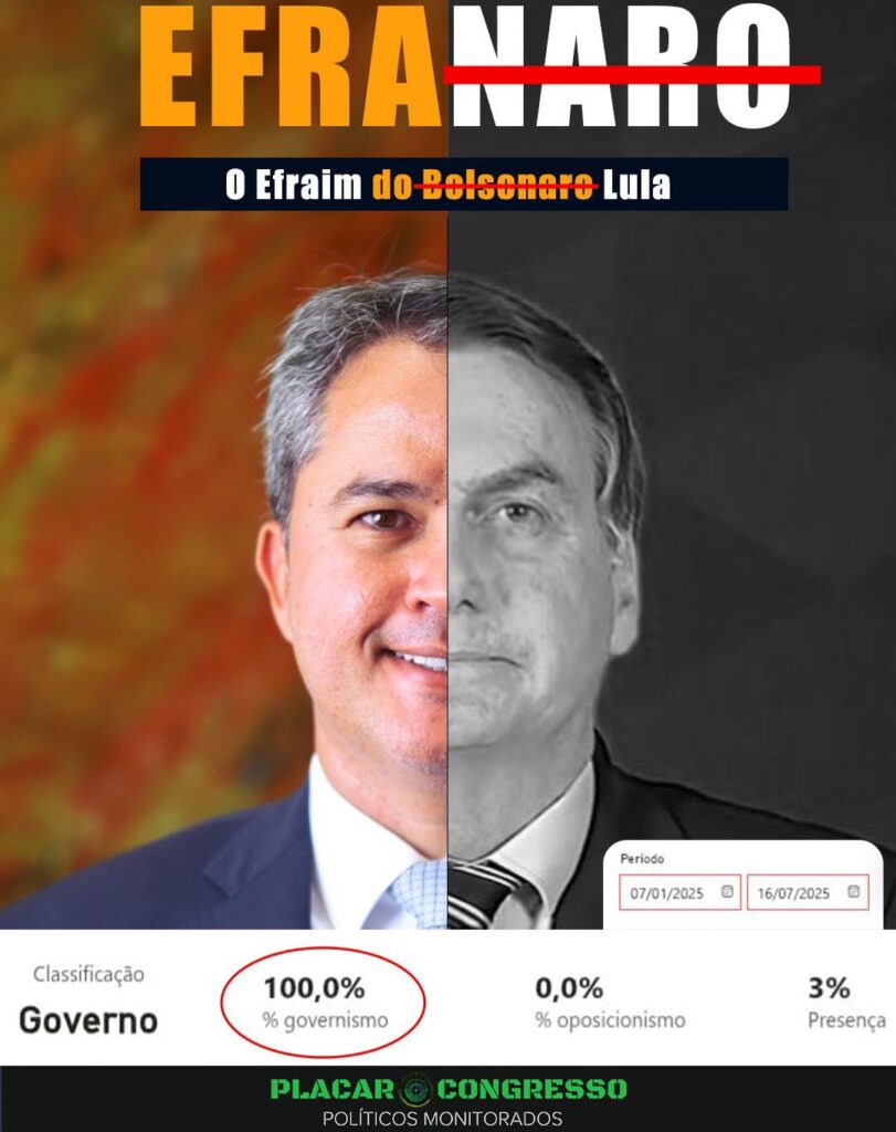 Durante os sete primeiros meses de 2025, Efraim foi 100% governo Lula — seja em votações, articulações ou posicionamentos públicos. Agora, grita “Mito! Mito!” em apoio a Jair Bolsonaro, tentando surfar na onda da popularidade do ex-presidente entre o eleitorado conservador da Paraíba.