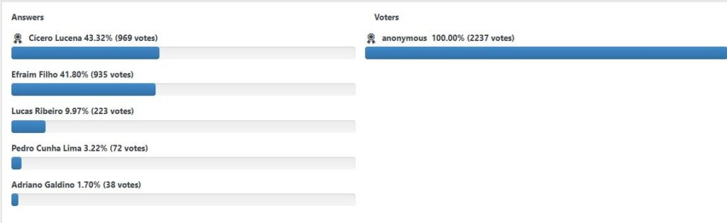 A mais recente enquete do blog Sem Arrudeio mostrou equilíbrio entre Cícero Lucena e Efraim Morais. Foram 2.237 votos colhidos em 80 grupos de WhatsApp da Paraíba sua maioria “Bolsonaristas”, e com IP fechado para evitar votos repetidos. O levantamento, disparado em grupos políticos, teve participação de eleitores com perfil mais engajado e consciente.