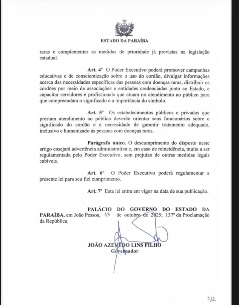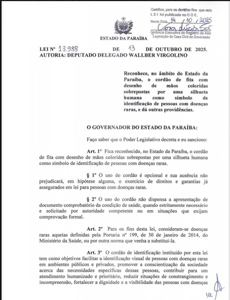 A Assembleia Legislativa da Paraíba aprovou uma importante lei de autoria do deputado estadual Wallber Virgolino (PL) que assegura visibilidade, empatia e acolhimento às pessoas que convivem com doenças raras.