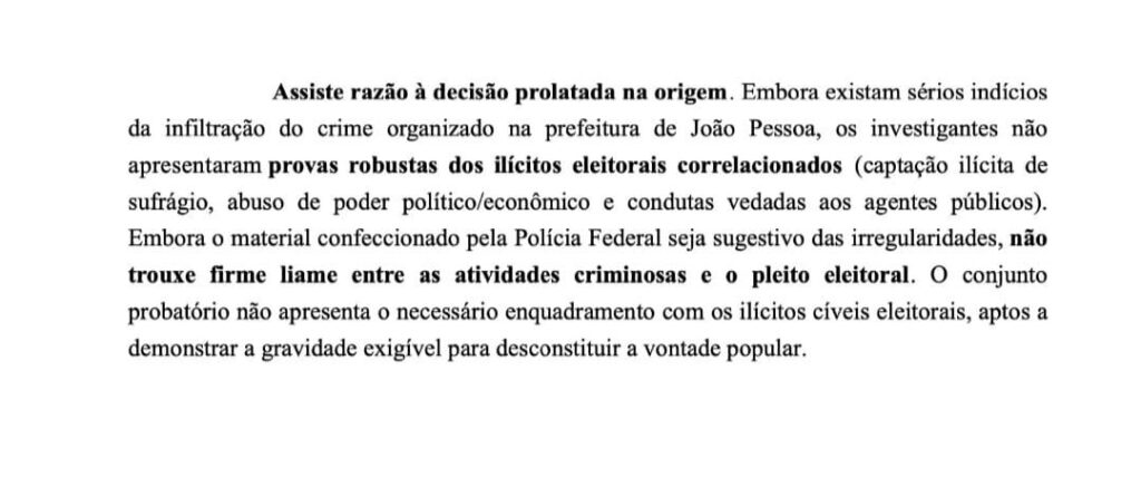 O procurador regional eleitoral Marcos Alexandre Queiroga foi direto ao ponto: “as provas dos autos não têm o condão de corroborar as afirmações deduzidas na inicial quanto aos cargos de prefeito e vice”. Ele destacou que os documentos apresentados se referem mais à atuação da facção criminosa “Nova Okaida” do que a qualquer ação eleitoral promovida por Cícero ou Léo.