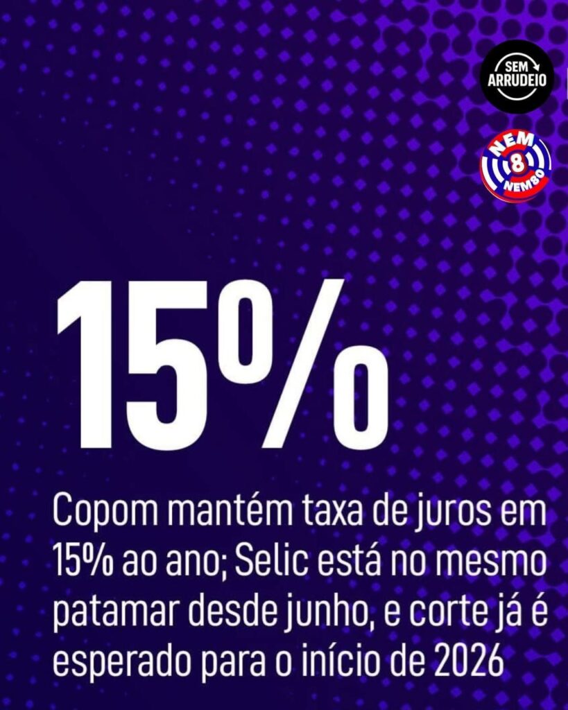 Copom mantém taxa de juros em 15% ao ano; Selic está no mesmo patamar desde de junho, e corte já é esperado para o início de 2026