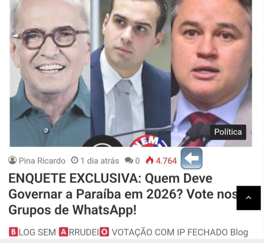 O Blog Sem Arrudeio realizou uma enquete sobre a disputa pelo Governo do Estado da Paraíba, mobilizando 100 grupos de WhatsApp ao longo de 24 horas.