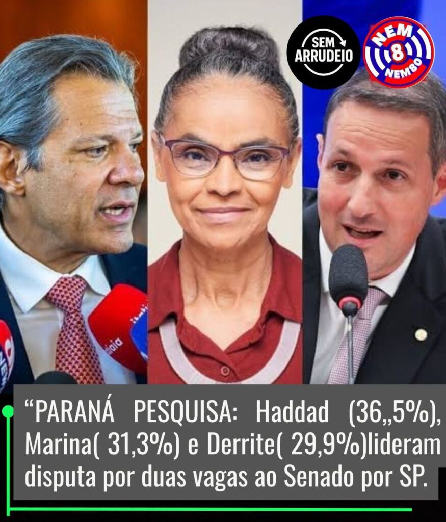 PARANÁ PESQUISA: Haddad (36,,5%), Marina( 31,3%) e Derrite( 29,9%)lideram disputa por duas vagas ao Senado por SP