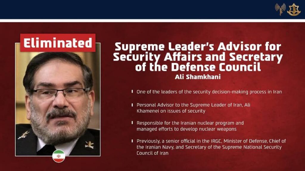 De acordo com o IDF, foram mortos durante a ofensiva inicial importantes nomes da estrutura militar e estratégica do país. Entre eles, Ali Shamkhani, secretário do Conselho de Segurança do Irã e conselheiro do líder supremo Ali Khamenei para assuntos de segurança.