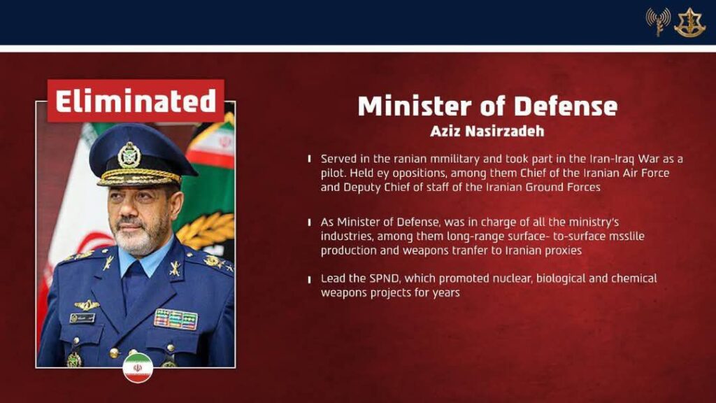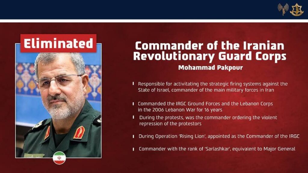 Também foi apontada a morte de Mohammad Pakpour, comandante da Guarda Revolucionária Islâmica (IRGC), descrito como um dos responsáveis pelo plano estratégico contra Israel e pela ativação de redes militares e apoio a forças aliadas do Irã na região, além de liderar ações de repressão interna.